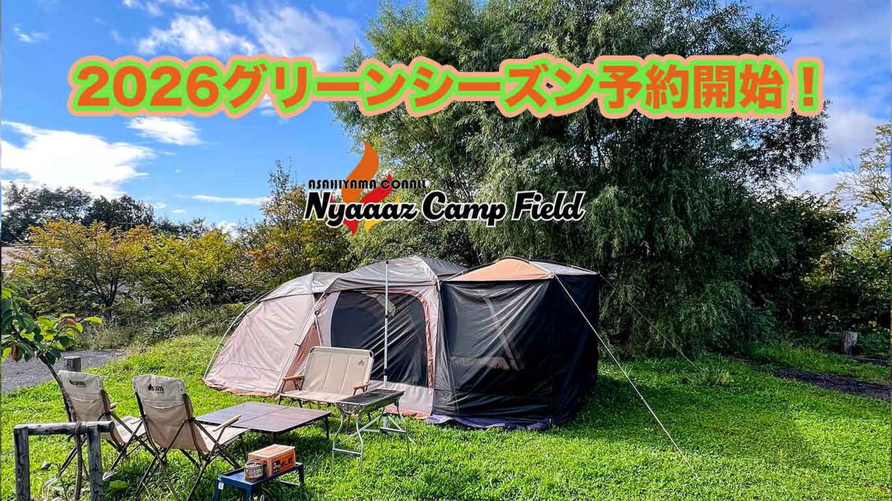 3月20日より、Nyaaaz Camp Field2026グリーンシーズンの予約受付を開始致しました。ゴールデンウィーク、夏休み期間中などは早期にご予約がいっぱいになる可能性がありますのでどうぞお早めにご予約ください。